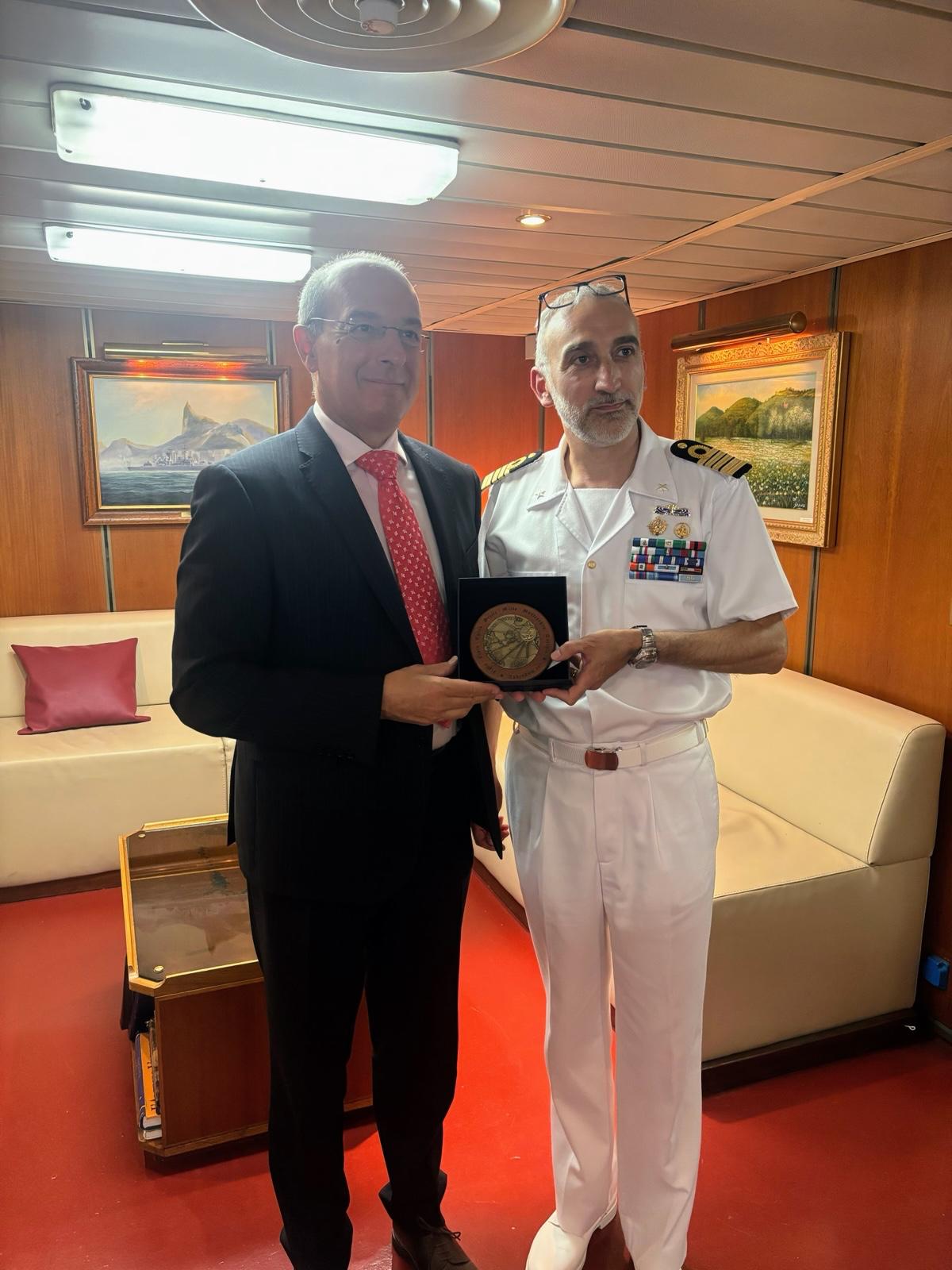 Ο Πρέσβυς, τον οποίο υποδέχθηκε ο Κυβερνήτης του πλοίου, Πλοίαρχος Luca Capobianco, επιθεώρησε το πλήρωμα και τους δόκιμους, επισημαίνοντας τη σημαντική συμβολή που προσφέρουν το προσωπικό και οι μονάδες του Ιταλικού Πολεμικού Ναυτικού στο πλαίσιο πολυάριθμων εθνικών και πολυμερών αποστολών για την προάσπιση της ειρήνης και της ασφάλειας στην ευρύτερη Μεσογείου, σε μία περίοδο ιδιαίτερα απαιτητική, με πλήθος συγκρούσεων και γενικευμένη αστάθεια.