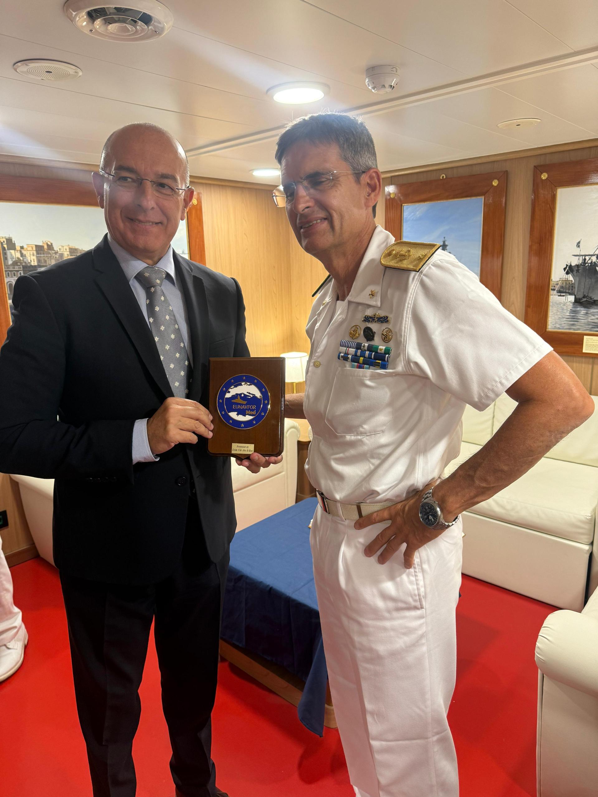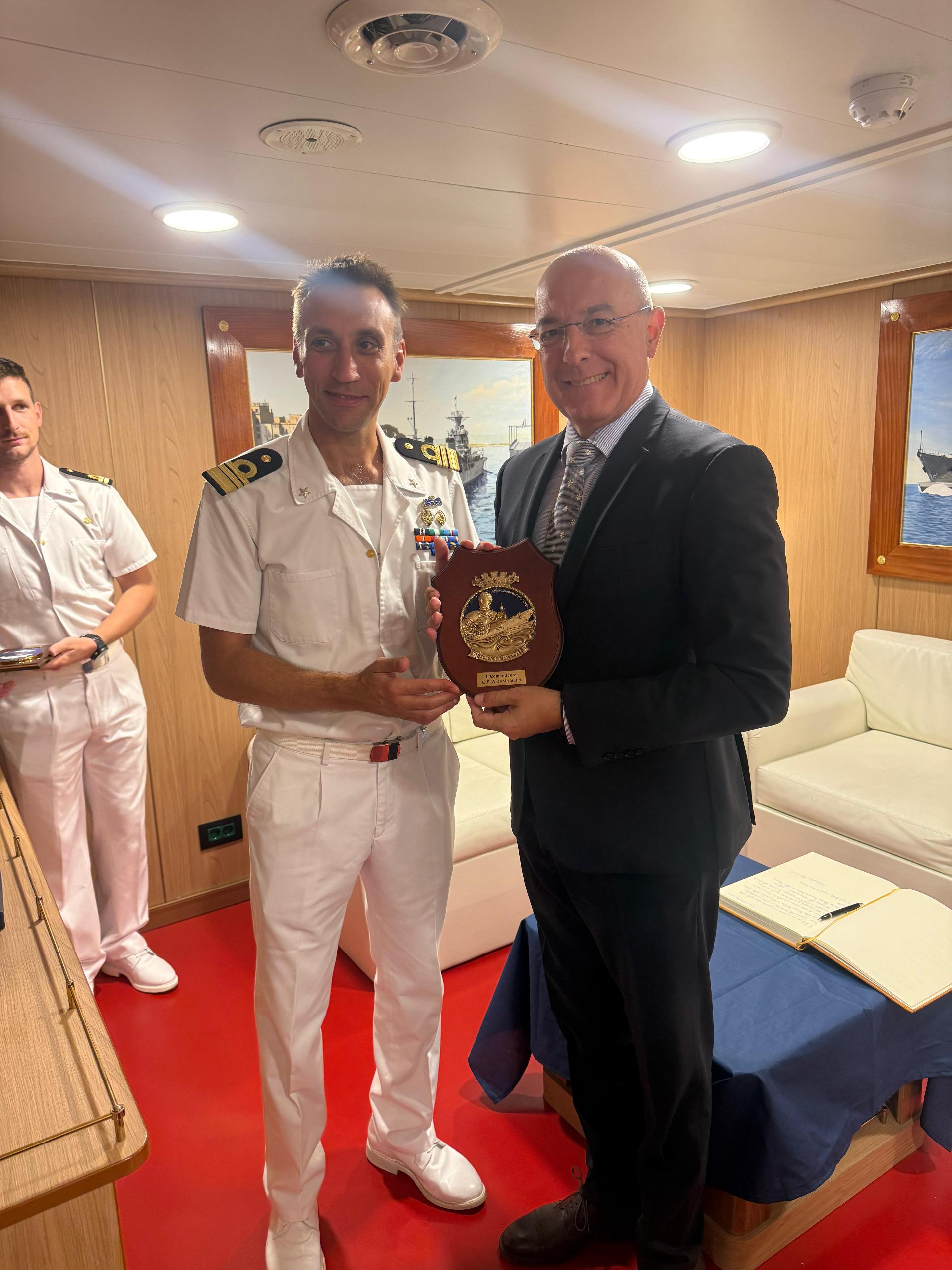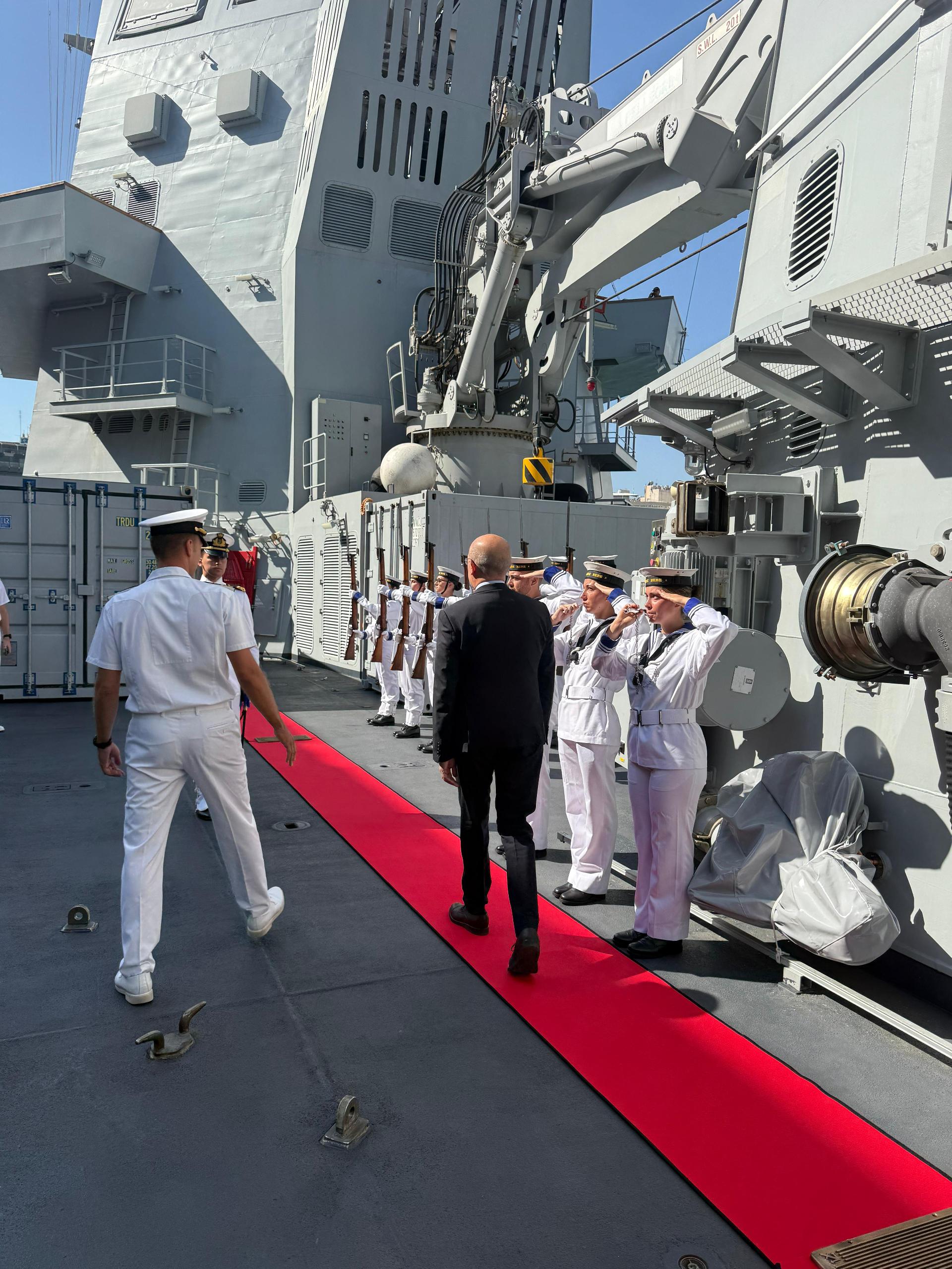 Τον Πρέσβυ υποδέχθηκαν ο Force Commander της Επιχείρησης, Υποναύαρχος Alessandro Di Biasi, και ο Κυβερνήτης της φρεγάτας, Πλοίαρχος Antonio Bufis. Ο Πρέσβυς κ. Cuculi επιθεώρησε το πλήρωμα και το προσωπικό που βρίσκεται επί του πλοίου και, κατά τη διάρκεια της επίσκεψης, υπογράμμισε τη σημασία της συμβολής του Ιταλικού Πολεμικού Ναυτικού στην καταπολέμηση της διακίνησης όπλων και ανθρώπων καθώς και του λαθρεμπορίου πετρελαίου. Τόνισε, τέλος, ότι η Ιταλία διαδραματίζει πρωταγωνιστικό ρόλο για την ασφάλεια στη Μεσόγειο.